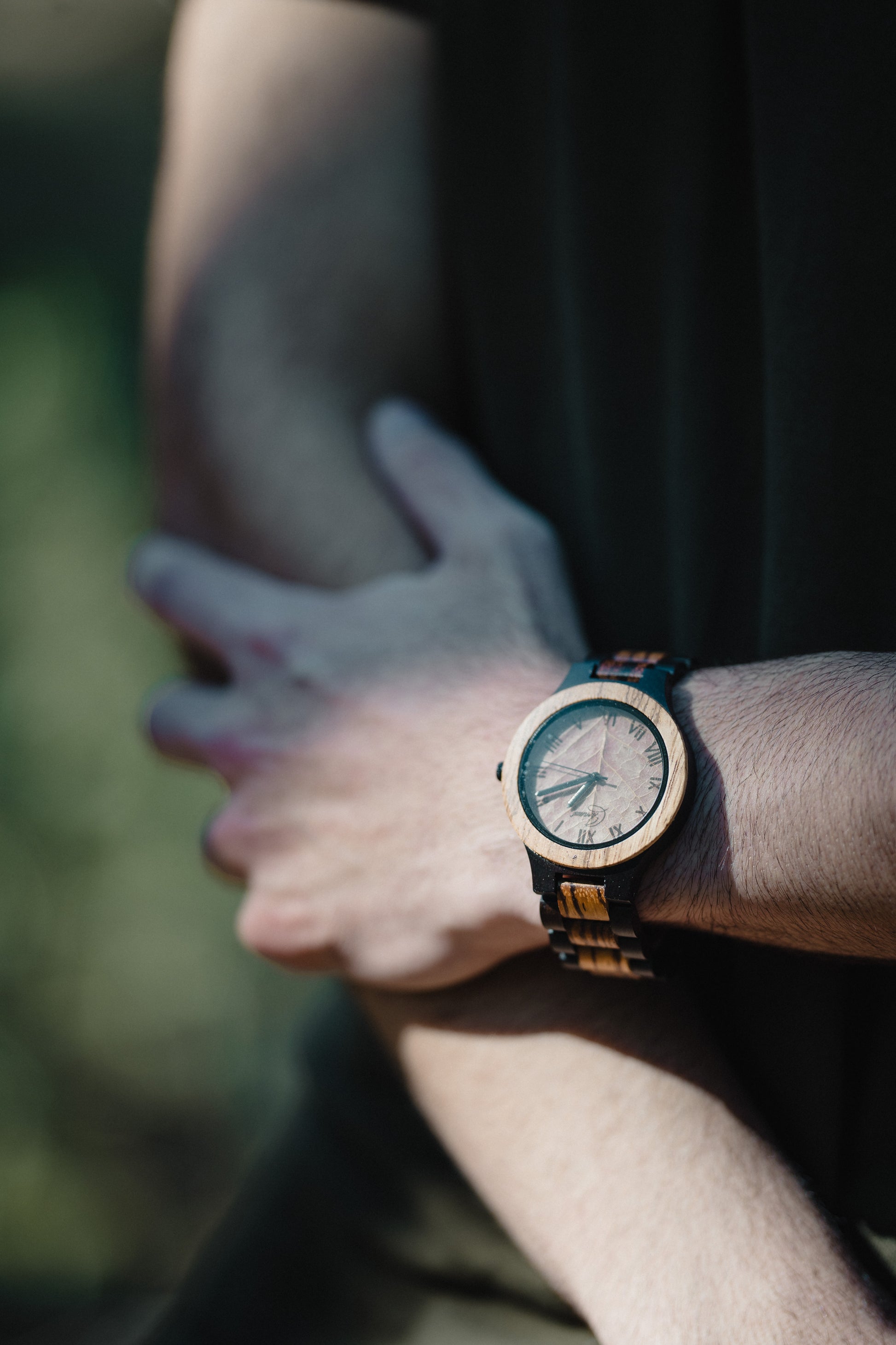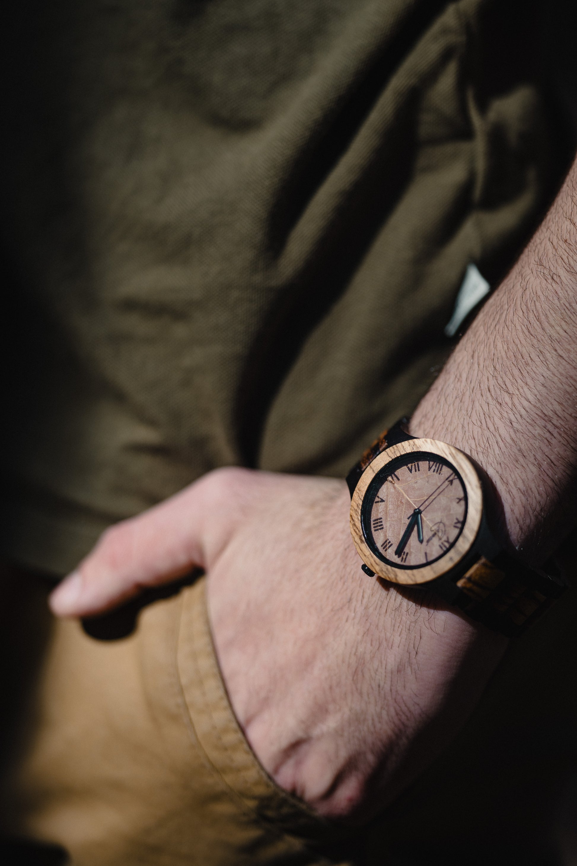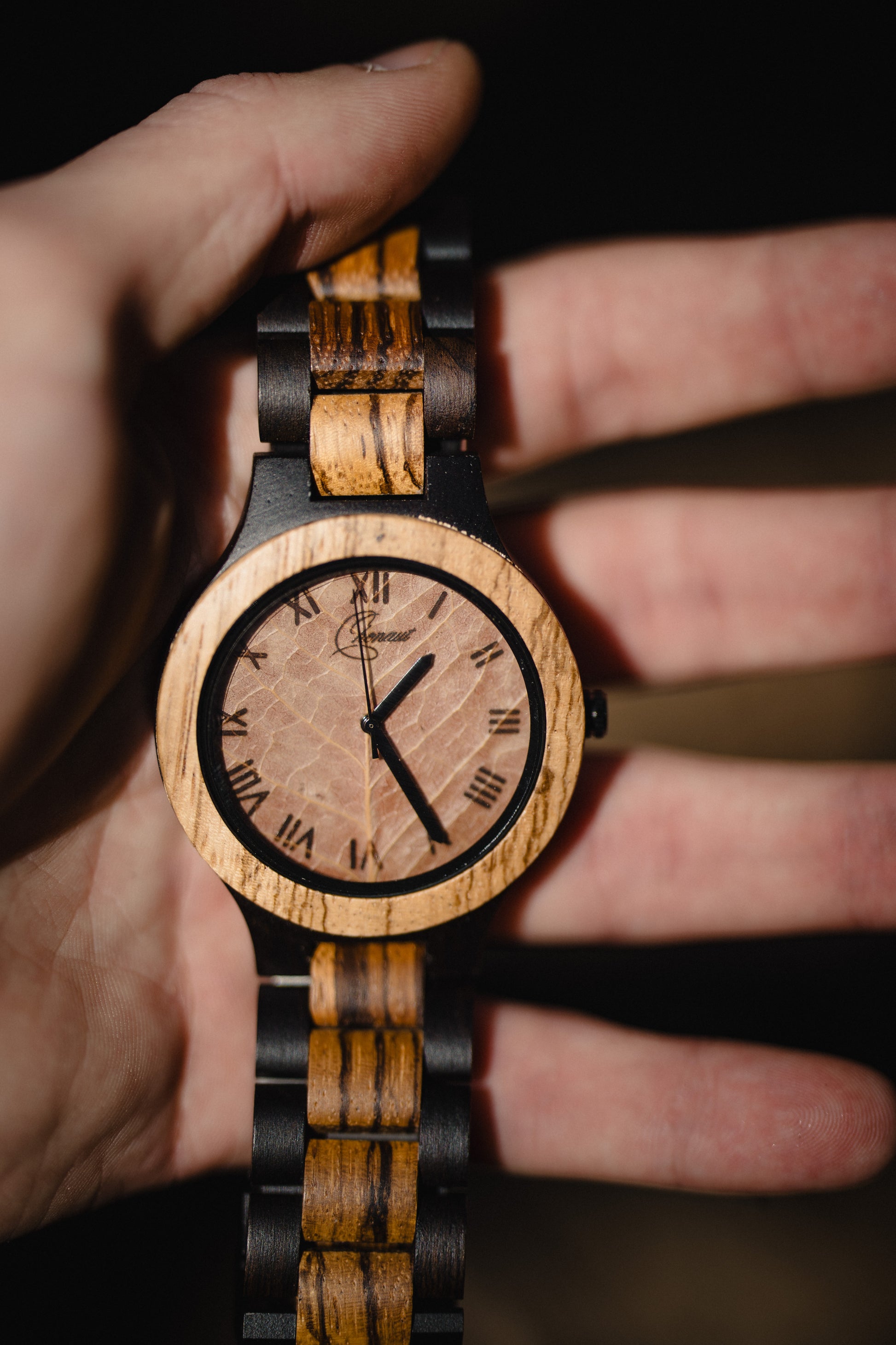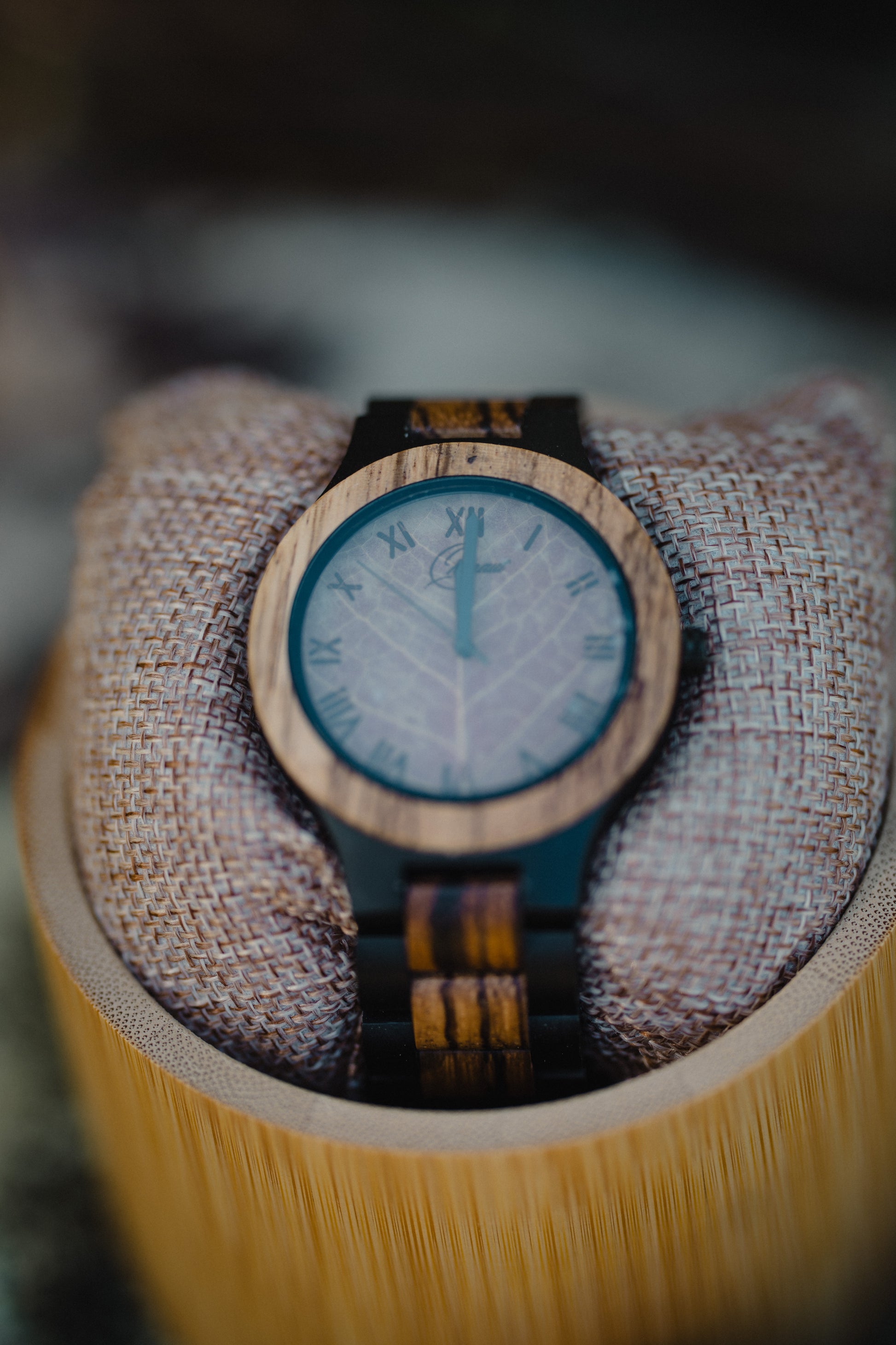 The light wood used throughout the watch, including the strap, gives it a warm and distinctive character. Laser-engraved Roman numerals on the dial and slim black hands add a classic touch that subtly contrasts with the natural leaf background.