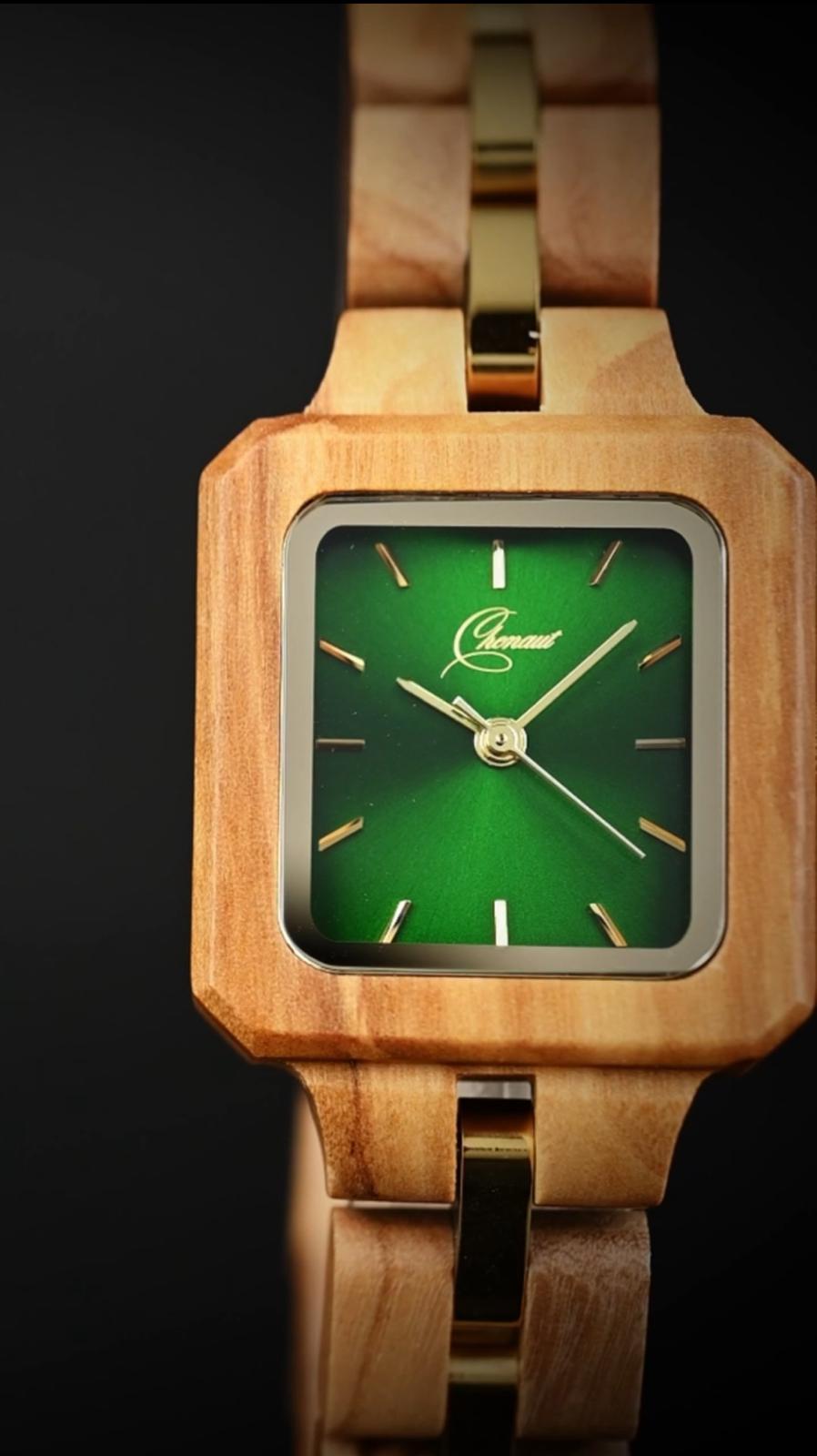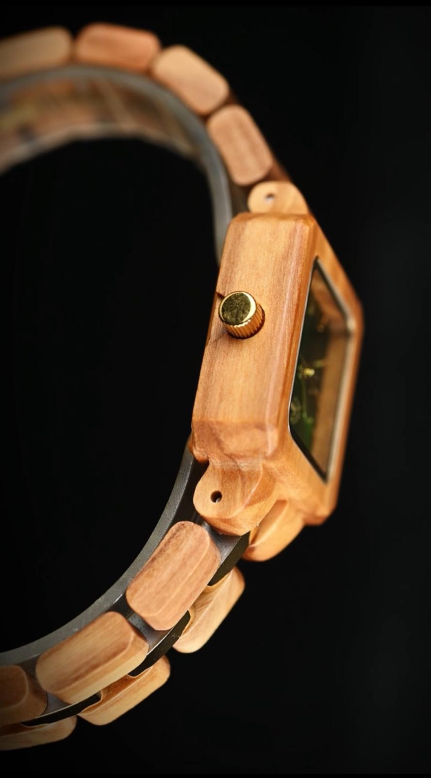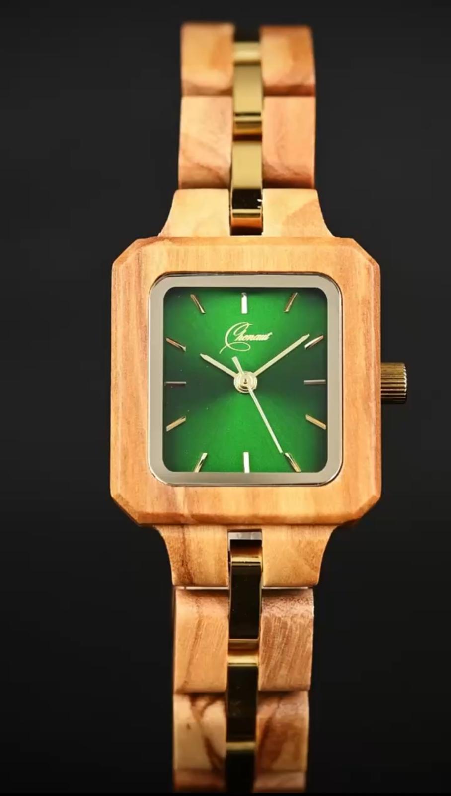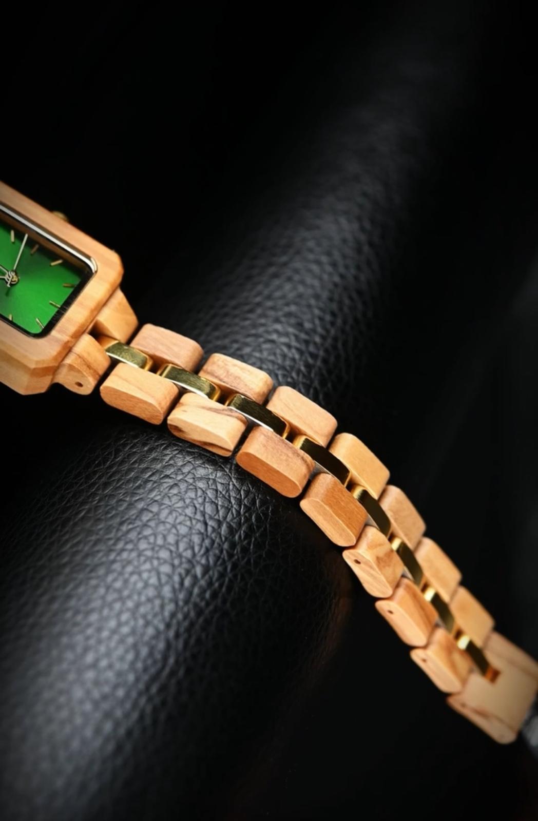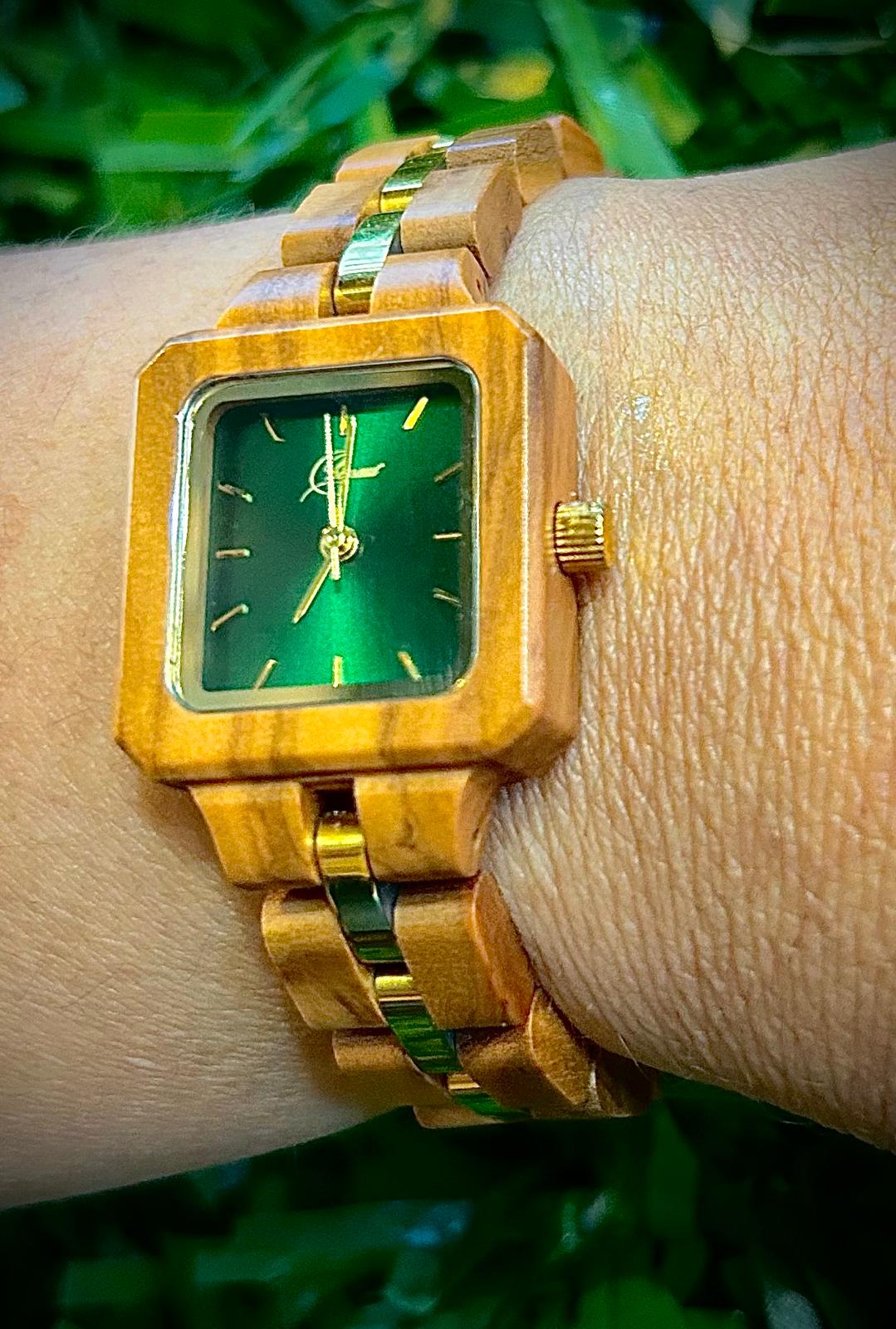 Es un reloj de madera con caja en olivo, esfera verde y malla en olivo con eslabones centrales metálicos en tono dorado.