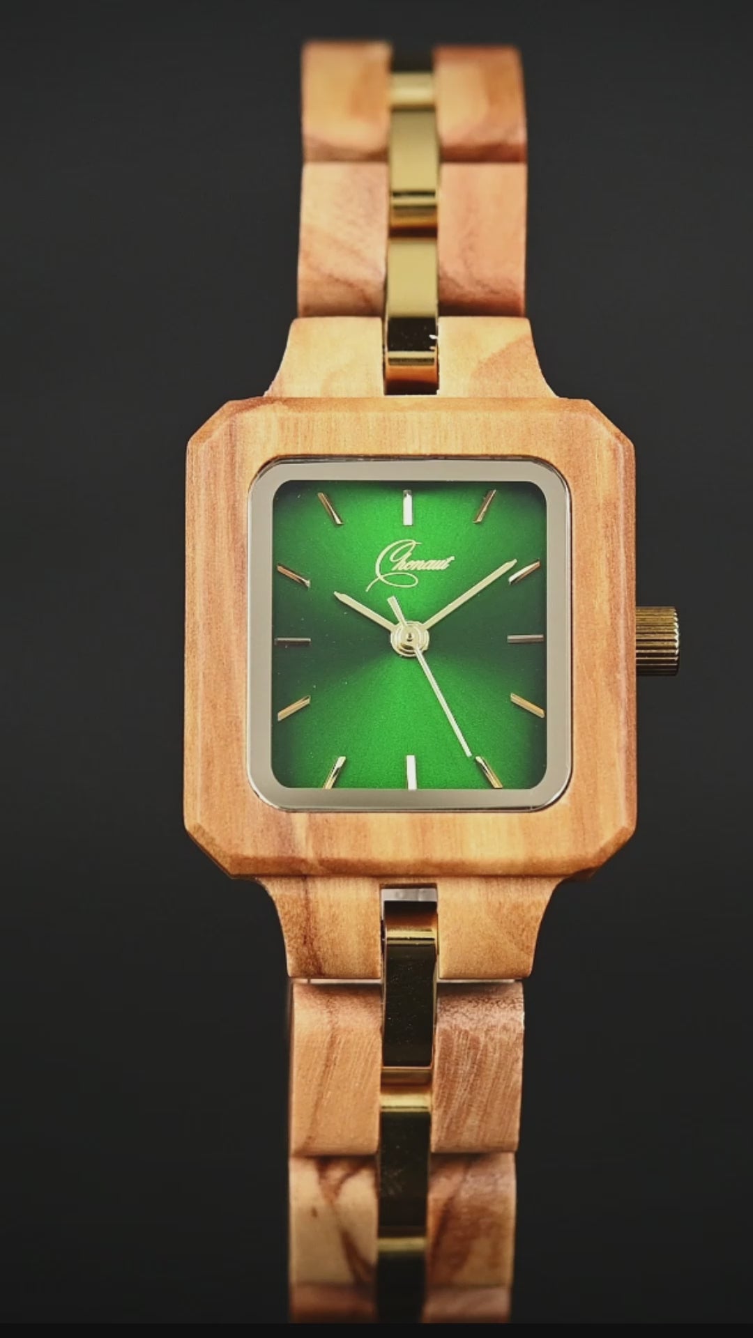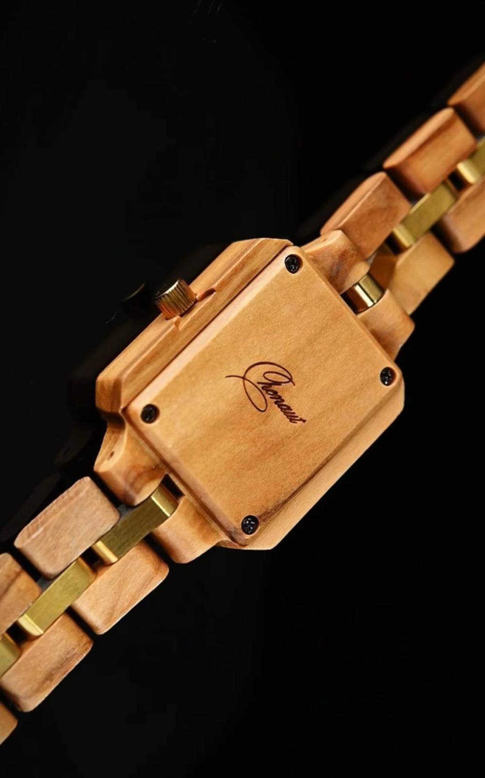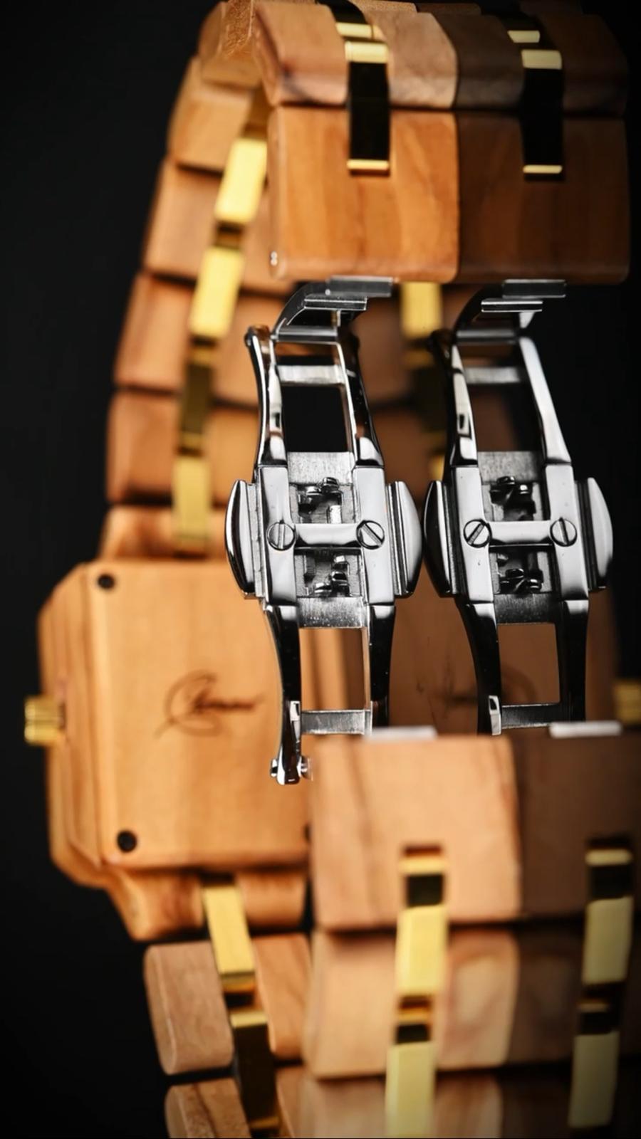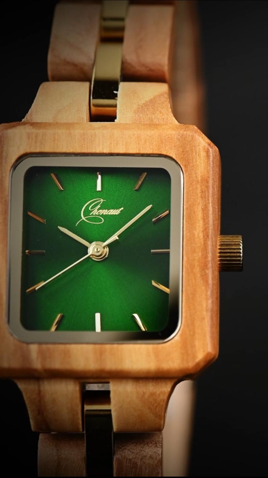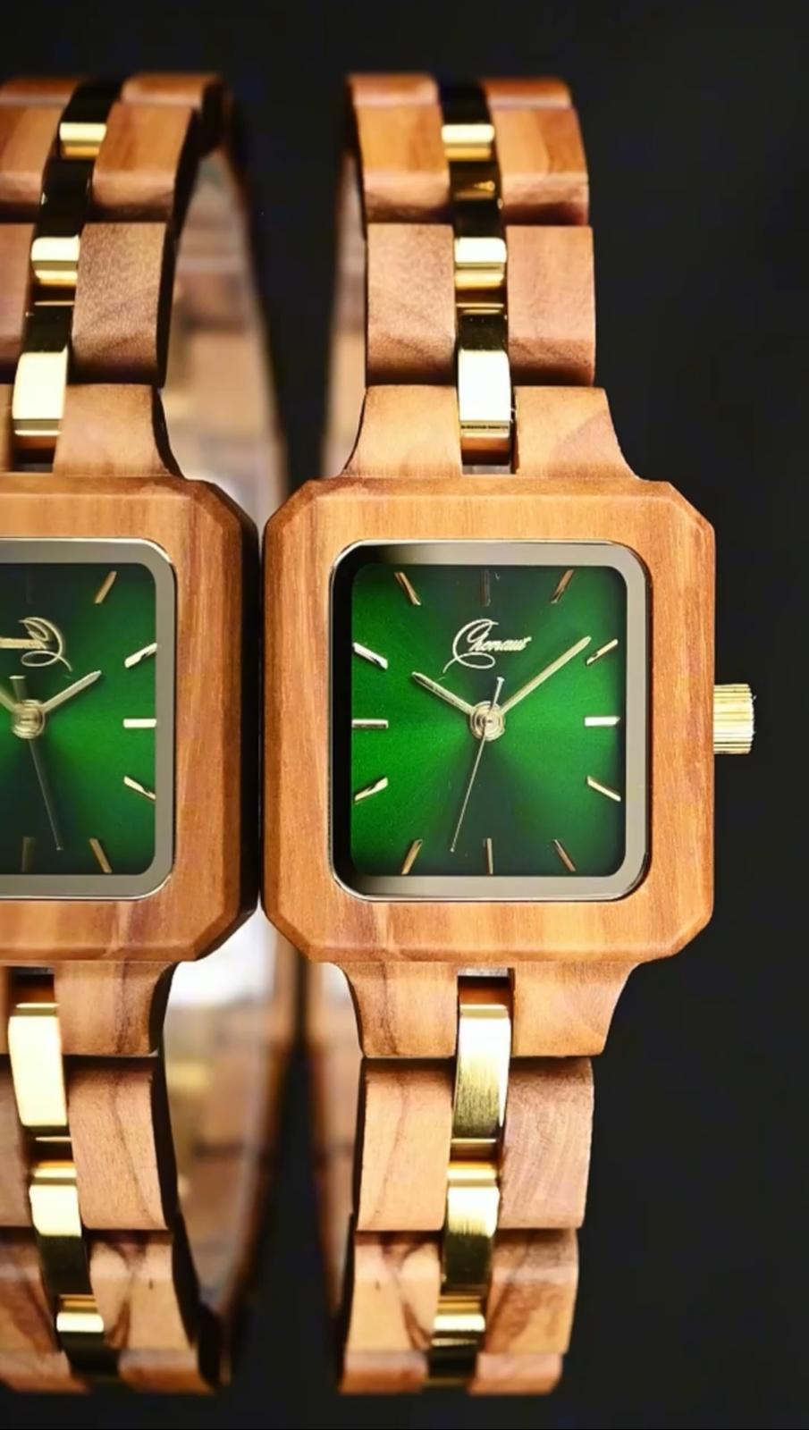 Es un reloj de madera con caja en olivo, esfera verde y malla en olivo con eslabones centrales metálicos en tono dorado.